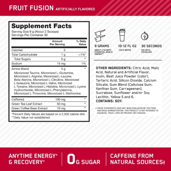 Amino Energy sirve para aumentar la energía y la concentración, mejorar la recuperación muscular y ayudar a la formación de músculo magro. Es un suplemento que combina aminoácidos con cafeína y otros energizantes naturales, con muy pocas calorías y sin azúcar. Se puede consumir en cualquier momento del día: antes, durante o después del entrenamiento.